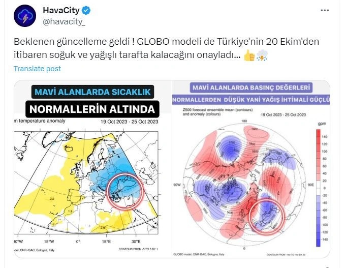 Meteorolojik kaynaklar ise Türkiye hakkında sıcak bir haber verdi. Kaynaklar tarafından aktarılan son bilgilere göre GLOBO modeli de Türkiye'nin 20 Ekim'den itibaren soğuk ve yağışlı tarafta kalacağını onayladı.