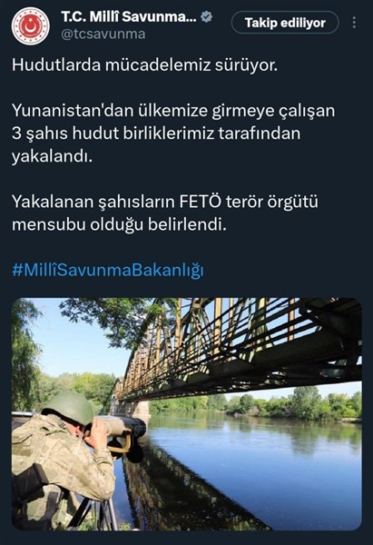 "Yunanistan'dan ülkemize girmeye çalışan 3 şahıs hudut birliklerimiz tarafından yakalandı. Yakalanan şahısların FETÖ terör örgütü mensubu olduğu belirlendi."