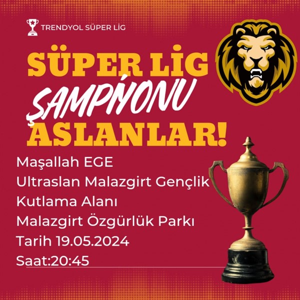 Kutlama etkinlikleri arasında, saat 20:45’de Malazgirt meydanında toplanmayı düşünen Galatasaray taraftarları meydanda yapılacak kutlamanın ardından büyük bir konvoy ile şehir turu atmayı planlıyor.