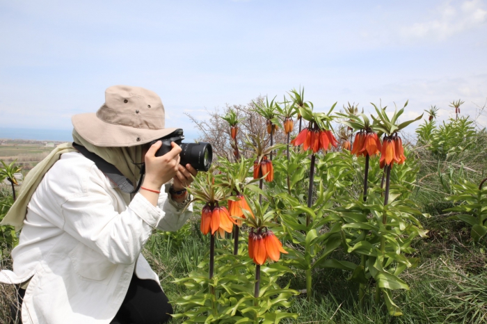 Erciş'te fotoğrafçılık kursunda eğitim gören 30 kursiyer de Dilmetaş Mahallesi'nde ters lalelerin çiçek açtığı bölgeyi gezdi.