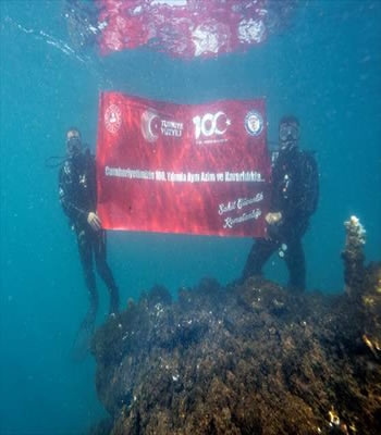 Van Gölü'nün doğal güzellikleriyle ülkenin en önemli değerlerinden biri olduğunu belirten Ceylan, "Cumhuriyet coşkusu ülkemizin dört bir yanında yaşanıyor. Biz de bu coşkuya su altında eşlik etmek istedik. Bu kapsamda çok özel bir yer tercih ettik. Ülkemizin en doğusundaki nadide güzelliklerden biri olan Van Gölü'ndeyiz. Burada özel bir dalış gerçekleştirdik." dedi.