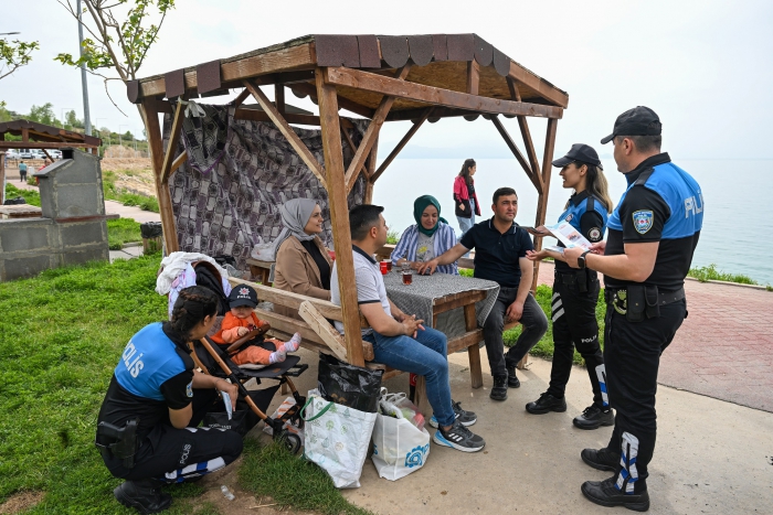 Van Emniyet Müdürlüğü Toplum Destekli Polislik Şubesi ekipleri, boğulma vakalarının yaşanmaması için Van Gölü kıyısında piknik yapan vatandaşlarla görüşerek uyarılarda bulunuyor.