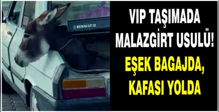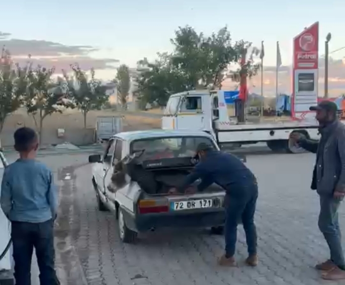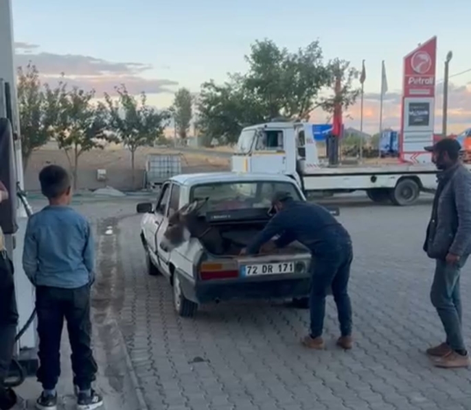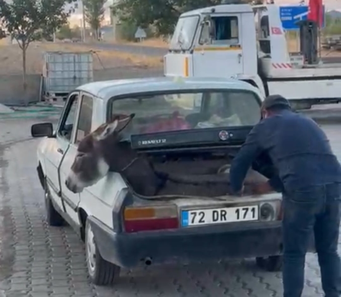 ALPARSLAN DİYARI- İlçeye bağlı Adaksu Köyündeki akaryakıt istasyonunda kaydedilen karede, eski model bir otomobilin bagajında taşınan eşek dikkat çekti.