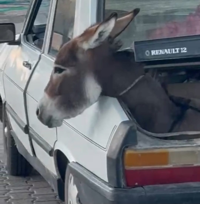 Bagaj kapağı kapatılamayınca hayvanın başı dışarıya çıktı ve ortaya renkli görüntüler çıktı. Sürücünün bagajdan eşeğini indirirken yaşadığı anlar çevredeki vatandaşların meraklı bakışlarına sahne oldu.