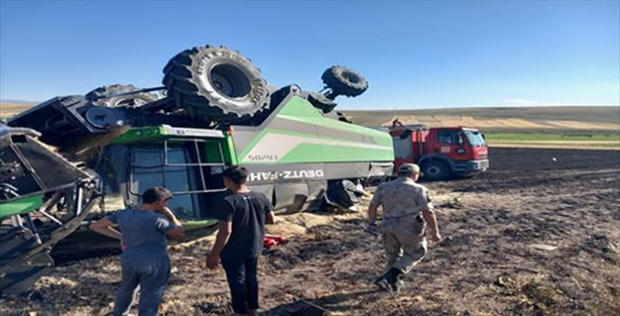 Alevlerin arasında kalan sürücü, yangından kaçmaya çalışırken biçerdöverin devrilmesi sonucu yaralandı.