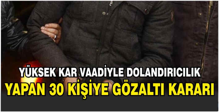 ALPARSLAN DİYARI- Karşıyaka Cumhuriyet Başsavcılığının yürüttüğü soruşturma kapsamında İzmir Emniyet Müdürlüğü Mali Suçlarla Mücadele Şube Müdürlüğü ekipleri, yüksek kar vaadiyle 30 kişiden 23 milyon lira toplayarak dolandırıcılık yaptıkları öne sürülen, bir holdingin sahibi S.O, eşi S.O. ve çalışanlarının da aralarında bulunduğu 30 şüpheliyi yakalamak için Çiğli ilçesindeki şirket binası ile bazı adreslere operasyon düzenledi.