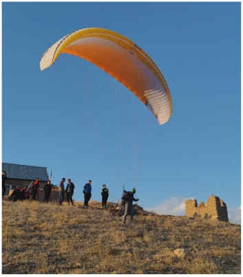 Kursiyerler, yamaç paraşütü eğitmeni Tur ve beraberindeki grupla, aldıkları eğitimin ardından ilçenin Yürekli köyü yakınlarında deneme uçuşu yaptı.