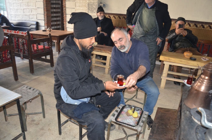 Vatandaşlarla fotoğraf çektiren gezgine bir çay ocağında çay ve közde pişirilmiş patates ikram edildi.