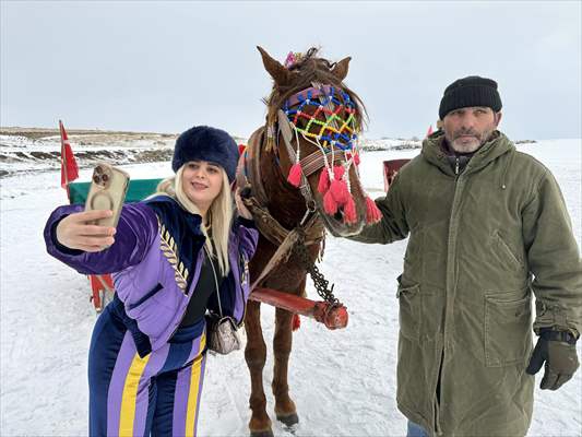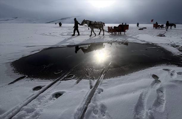 Yerli ve yabancı turistler, göldeki gezintinin ardından bindikleri atlı kızaklarla fotoğraf çekiliyor.