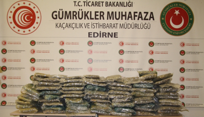 Yakın takibe alınarak x-ray tarama sistemine sevk edilen araçta şüpheli yoğunluk tespit edilmesi üzerine, hassas burunlu narkotik dedektör köpeklerin yardımlarıyla yapılan detaylı arama sonucunda tır dorsesinin taban kısmına gizlenmiş vaziyette 160 şeffaf poşet halinde yaklaşık 180 kilogram esrar cinsi uyuşturucu madde ele geçirildi.