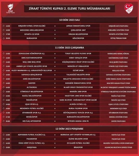ALPARSLAN DİYARI- Ziraat Türkiye Kupası'nda 2. tur eleme müsabakalarının programı açıklandı. Türkiye Futbol Federasyonundan yapılan açıklamaya göre 2. tur mücadelelerine 1. eleme tur maçlarında tur atlayan 31, TFF 2. Lig'den 19 olmak üzere toplam 50 takım katılacak.