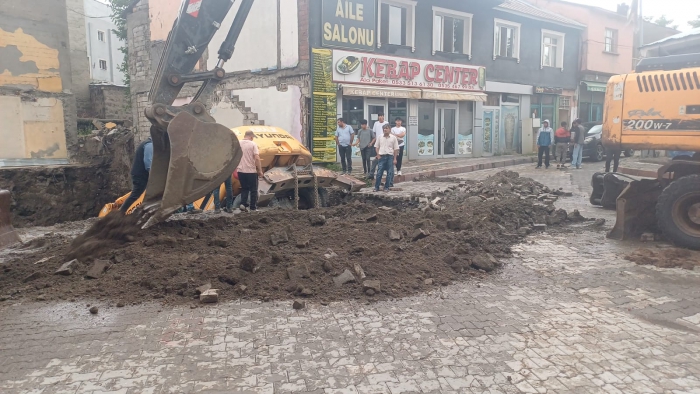 Malazgirt'te etkili olan şiddetli yağmur, inşaat alanında çalışan işçileri ve makineleri zor durumda bıraktı.